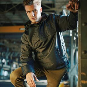 Wind and water-repellent. Durable, high value nylon with mesh lining, 2 lateral pockets with zipper, lateral ventilation hole, all zippers with zip-puller and hood with drawstring. Reach certified.